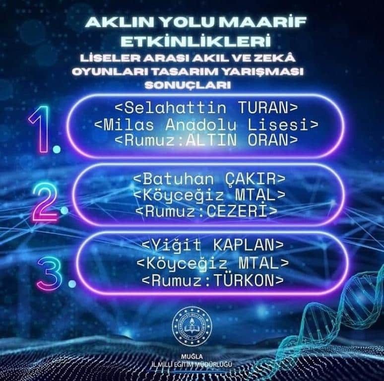 Aklın Yolu Maarif Etkinlikleri kapsamında Muğla İl Milli Eğitim Müdürlüğü tarafından düzenlenen Liseler Arası Akıl ve Zeka Oyunları Tasarım Yarışmasında Dereceler Bizim